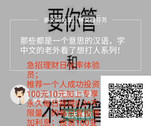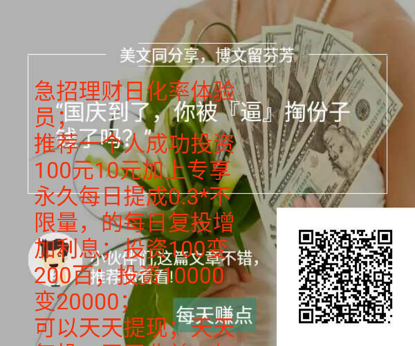 急招理财日化率体验员; 推荐一个人成功投资100元10元加上专享永久每日提成0.3*不限量,的每日复投增加利息;投资100变200百;投资10000变20000; 可以天天提现;天天复投;天天收益;加我微信vxworlk;